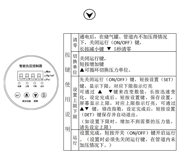智能壓力控制器:高精度光電原理控制,0-98KPA內自由調節上限(停止),下限(啟動)。